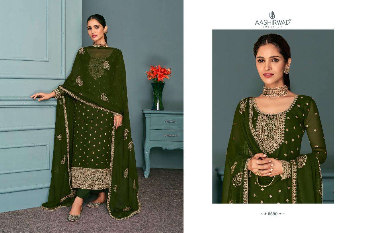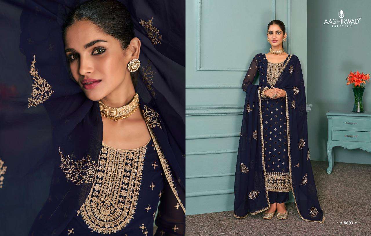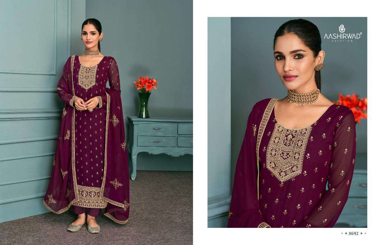 AASHIRWAD CREATION PRESENT CHANDNI REAL GEORGETTE WITH EMBROIDERY WORK SEMI STITCHED DESIGNER SUIT IN WHOLESALE PRICE IN SURAT - SAI DRESSES