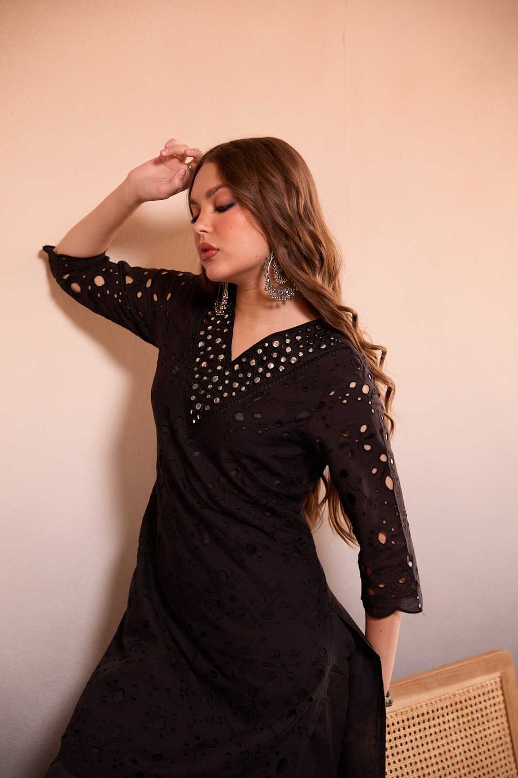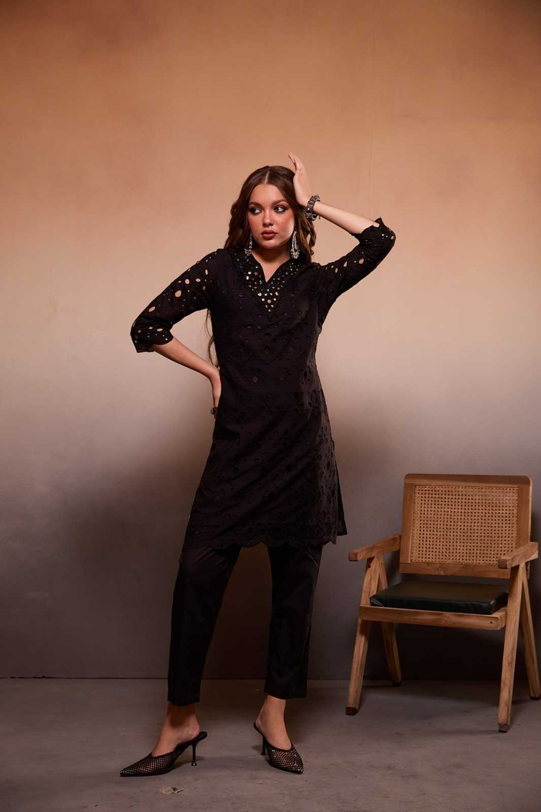 BLACK PURE COTTON BORING WITH PAPER MIRROR WORK TO FESTIVE WEAR COLAR STRAIGHT CUT CORD SET STYLE DESIGNER 2 PIECE COMBO SUITS IN WHOLESALE RATE IN SURAT