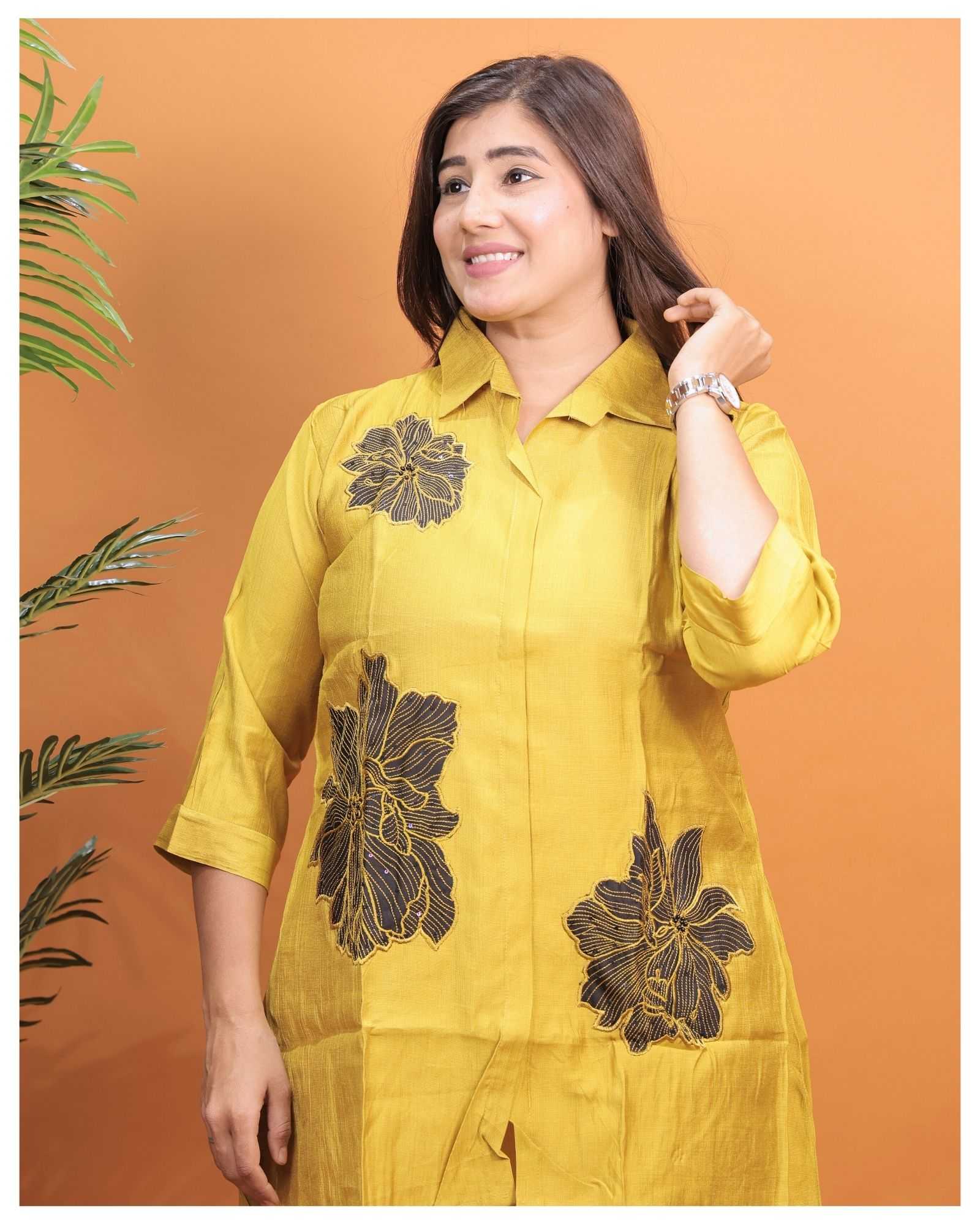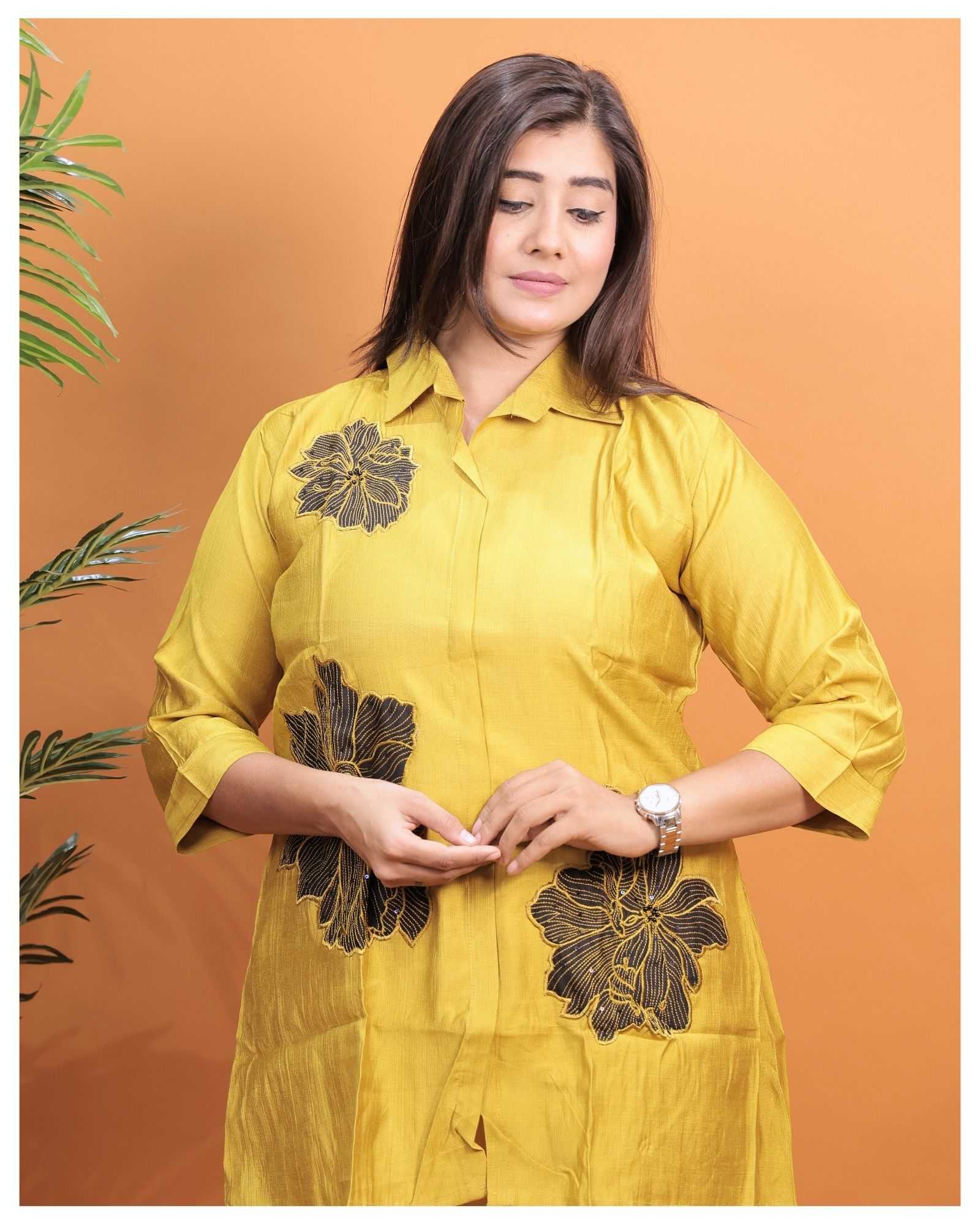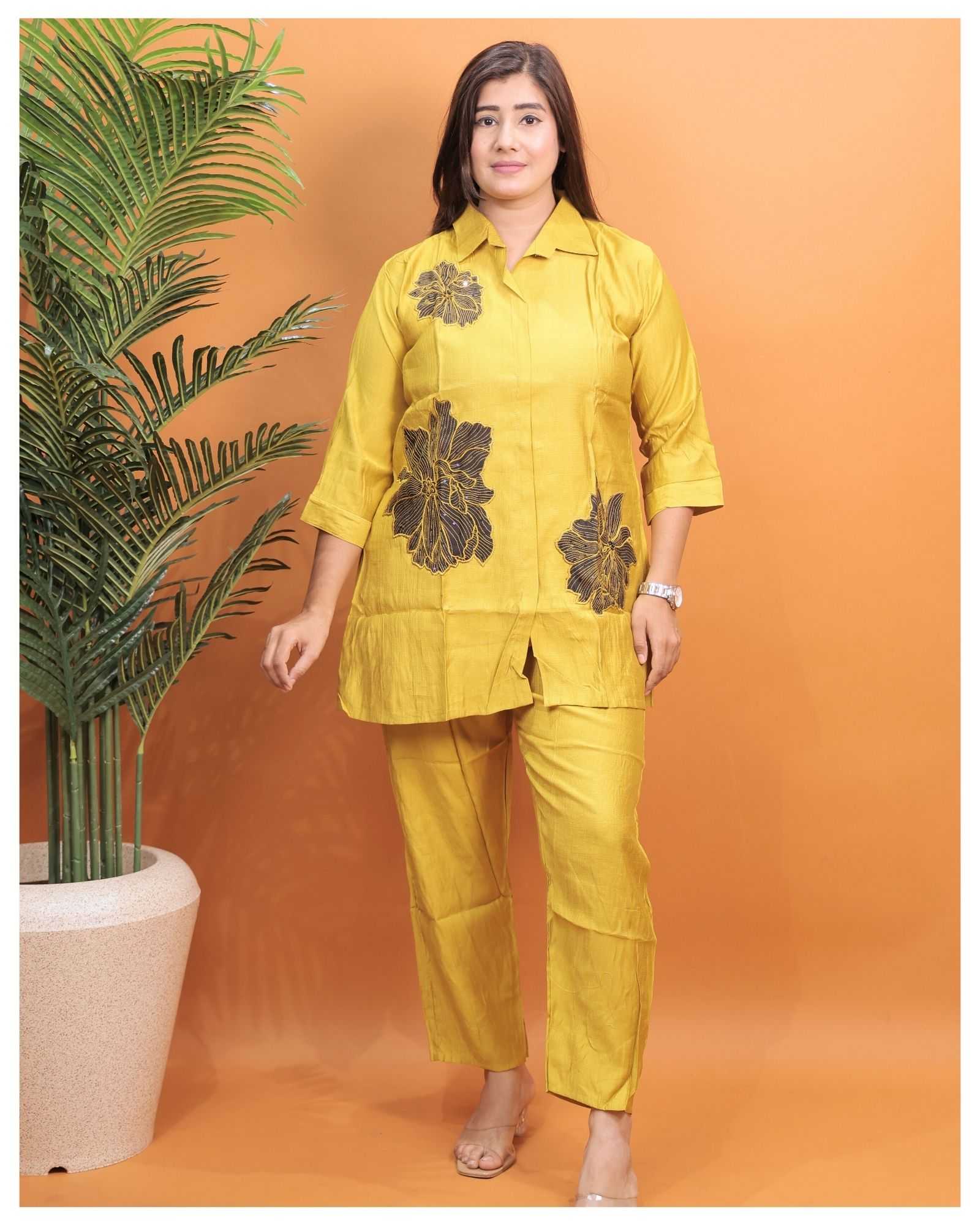 GOLD ROMAN SILK WITH EMBROIDERY WORK TO FESTIVE WEAR COLAR STRAIGHT CUT CORD SET STYLE DESIGNER 2 PIECE COMBO SUITS IN WHOLESALE RATE IN SURAT