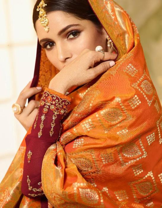 TOP – SATIN GEORGETTE BOTTOM – DULL SANTOON DUPATTA – BANARASI SILK
