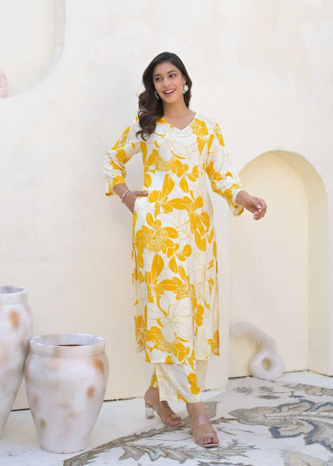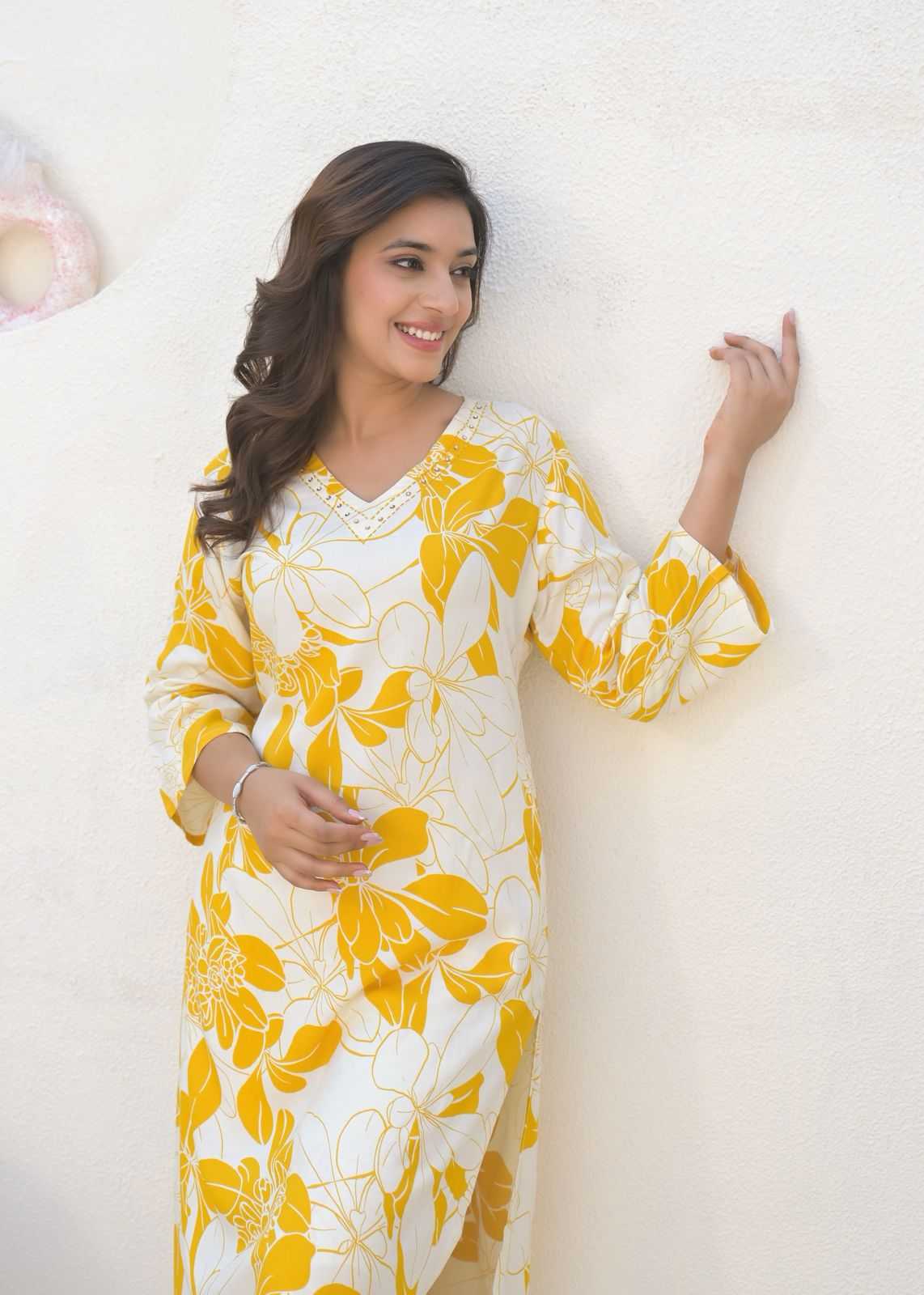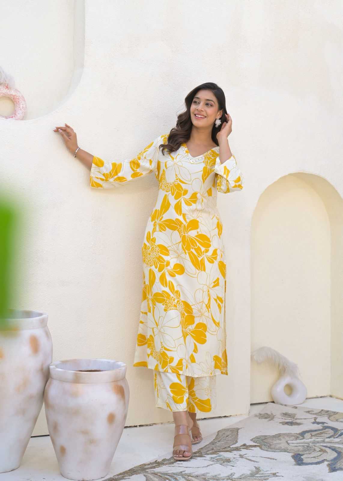 MOON YELLOW HEAVY REYON WITH WORK TO FESTIVE WEAR KURTI PANT STYLE DESIGNER 2 PIECE COMBO SUITS IN WHOLESALE RATE IN SURAT