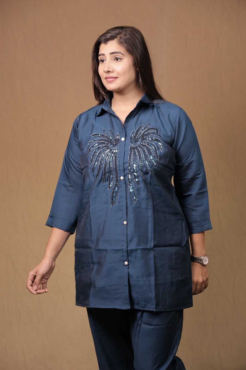 NAVY BLUE ROMAN SILK WITH HEAVY HANDWORK TO FESTIVE COLAR WEAR STRAIGHT CUT CORD SET STYLE DESIGNER 2 PIECE COMBO SUITS IN WHOLESALE RATE IN SURAT