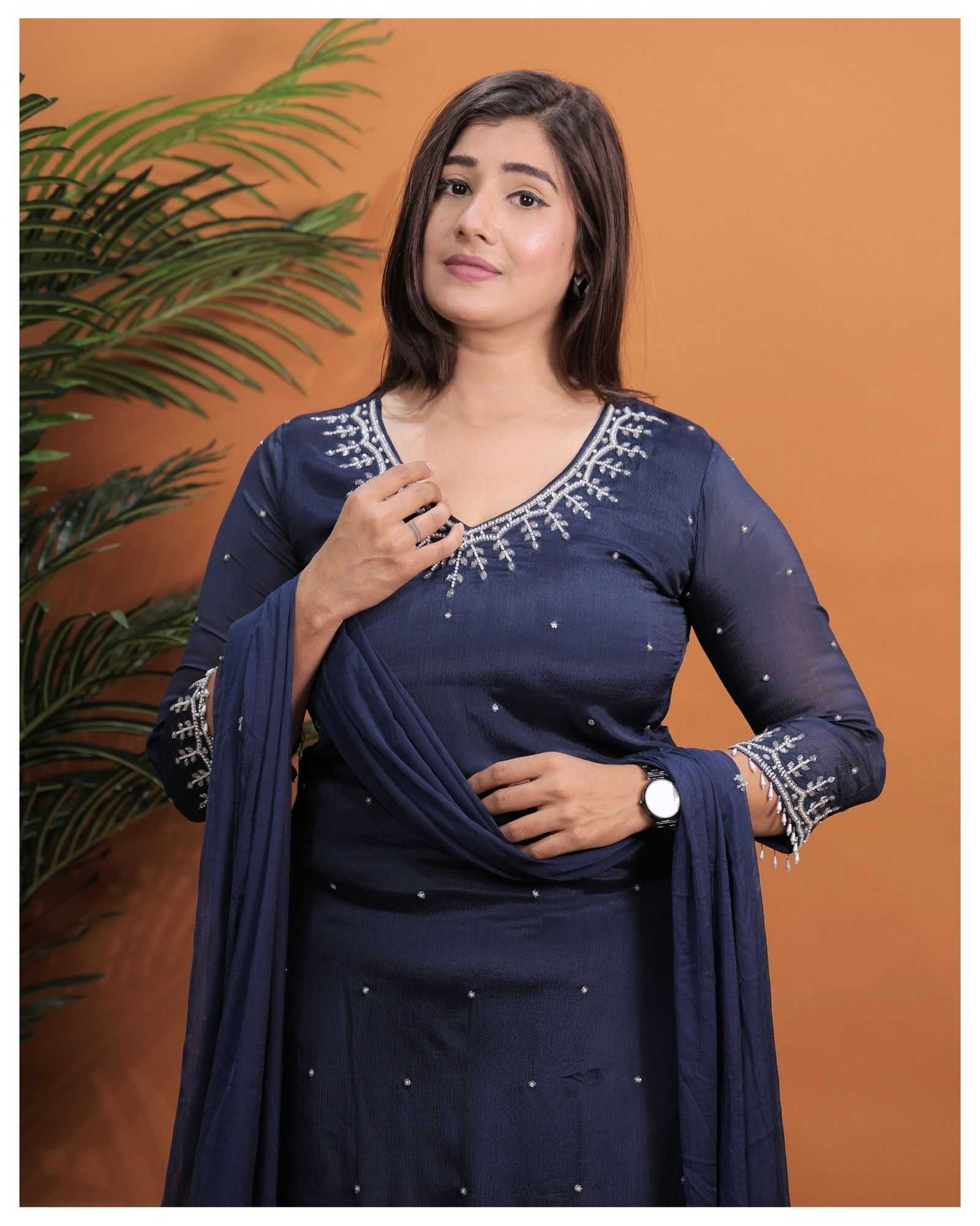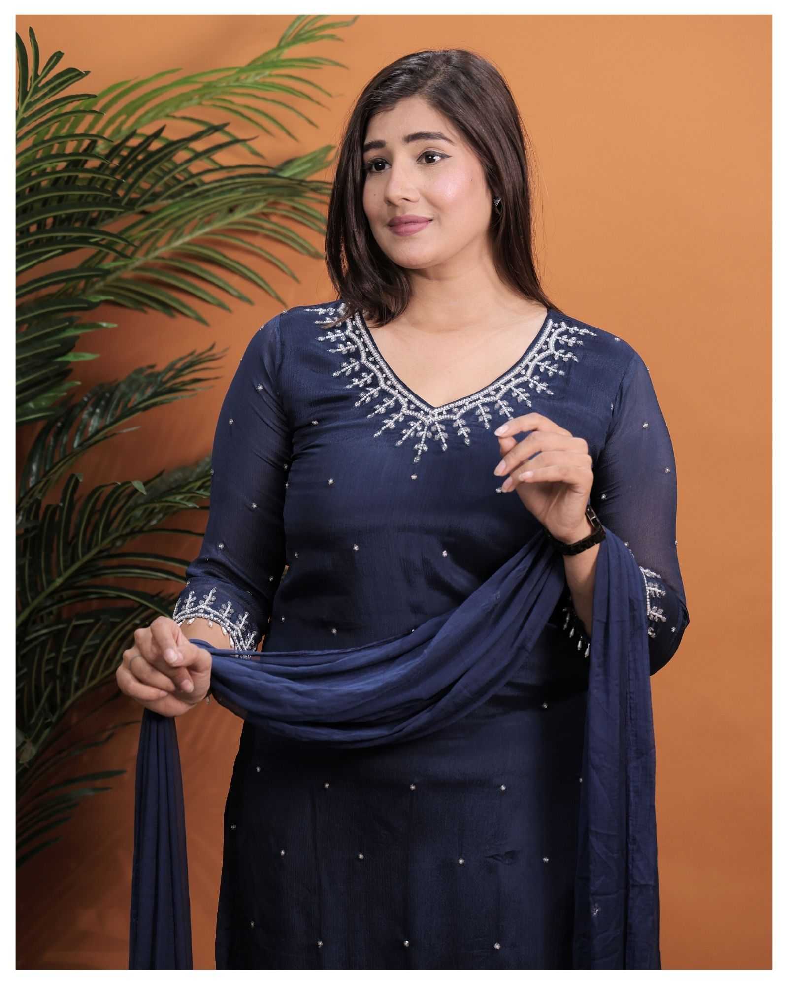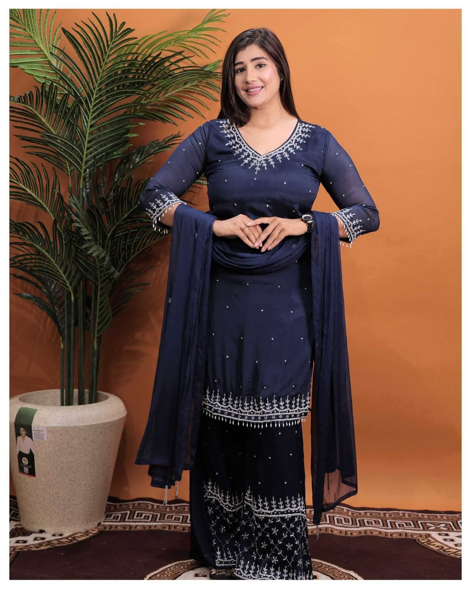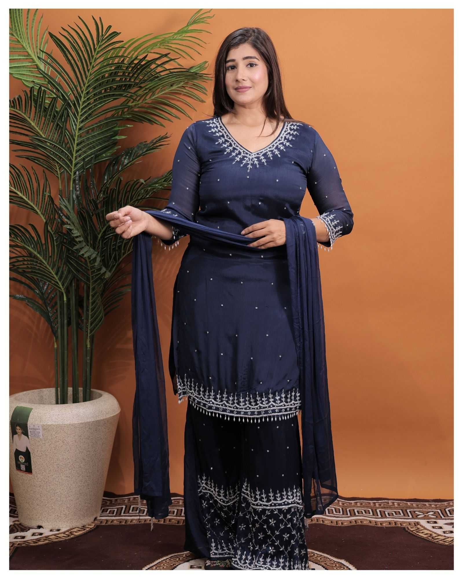 PURE CHINON WITH HEAVY HANDWORK READY TO FESTIVE WEAR STRAIGHT CUT KURTI WITH PLAZZO STYLE DESIGNER 3 PIECE COMBO SUITS IN WHOLESALE RATE IN SURAT