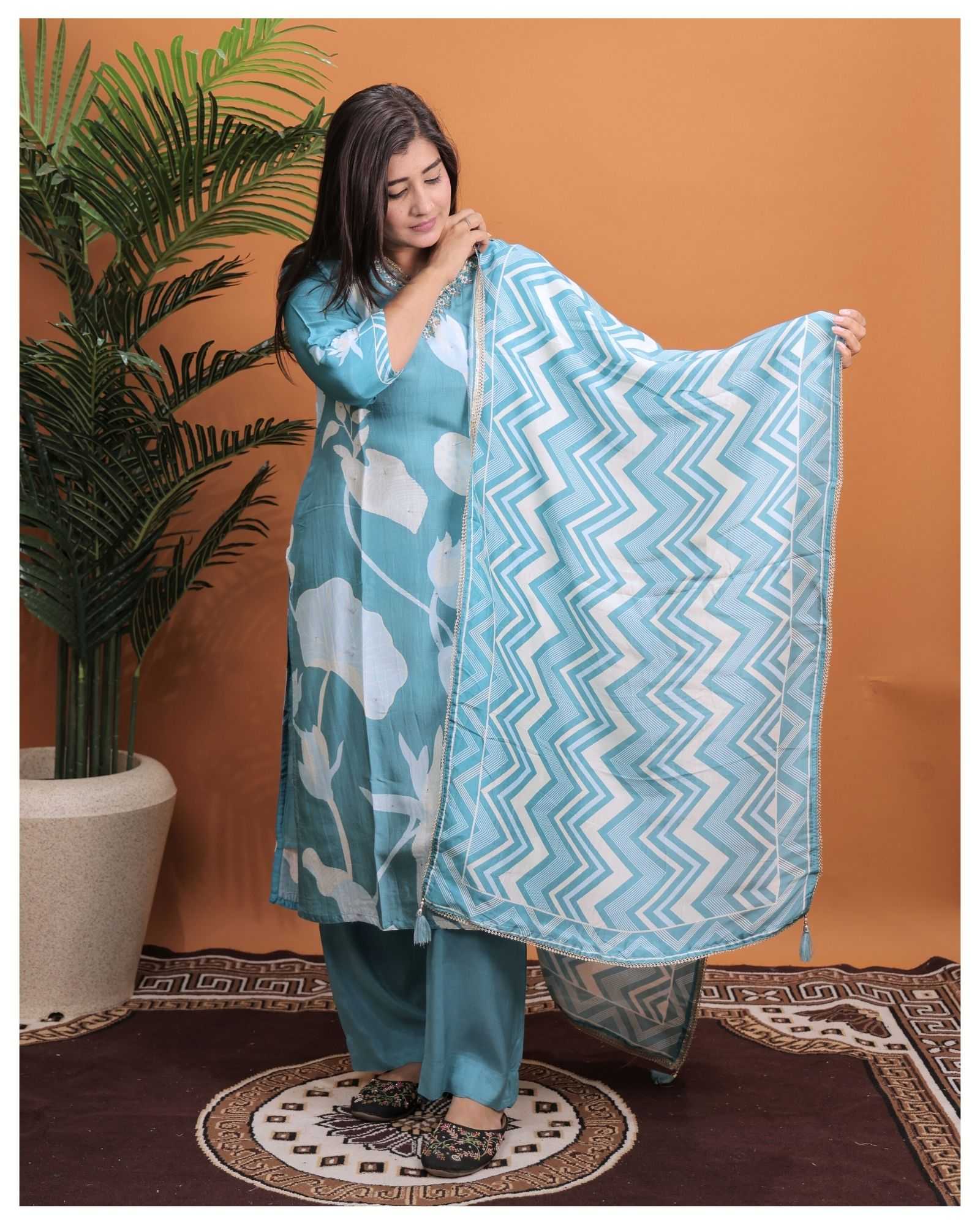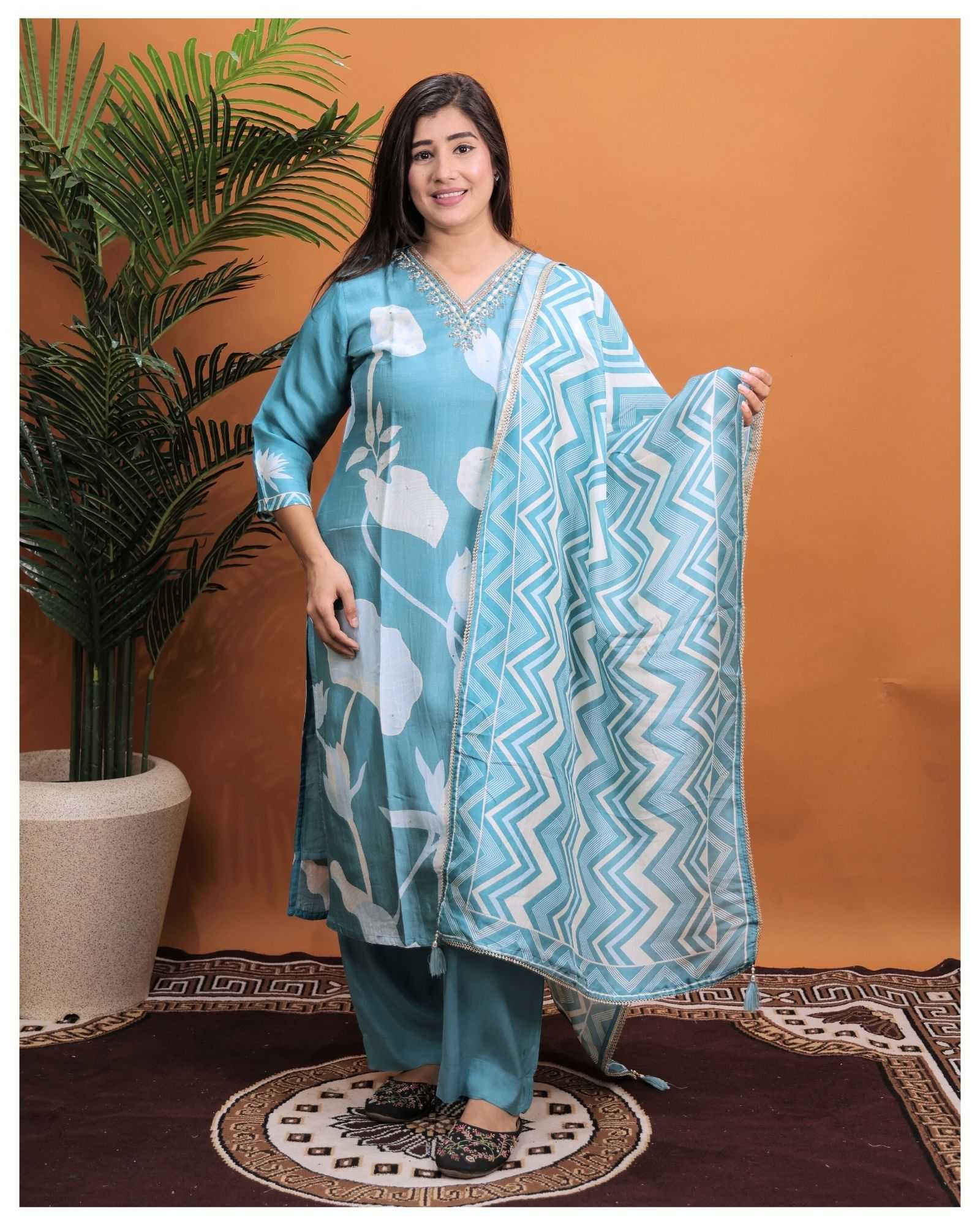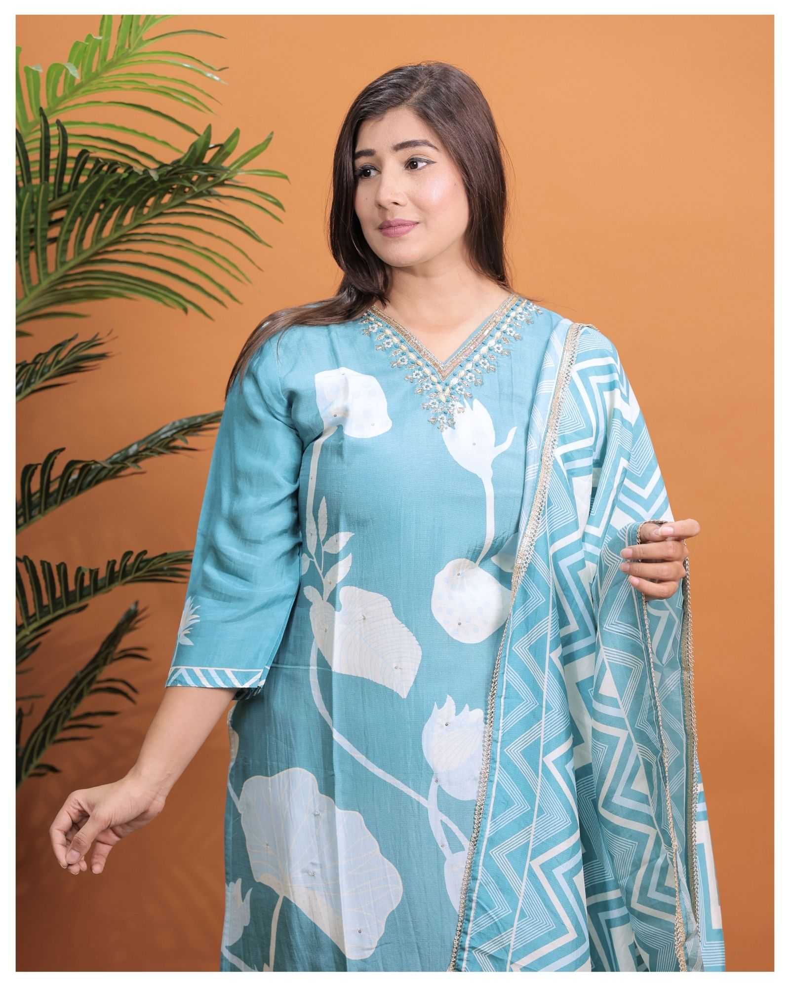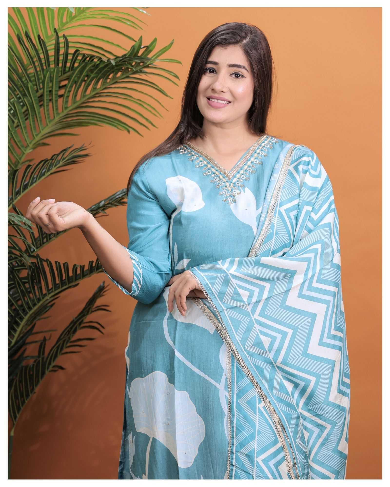 PURE MUSLIN WITH HEAVY HANDWORK READY TO FESTIVE WEAR STRAIGHT CUT KURTI WITH PAINT STYLE DESIGNER 3 PIECE COMBO SUITS IN WHOLESALE RATE IN SURAT