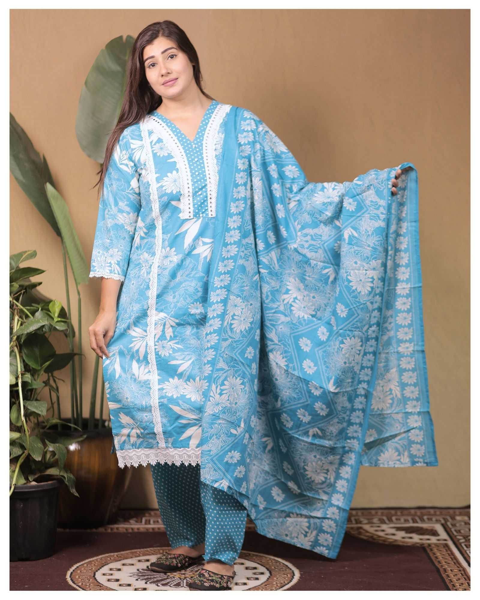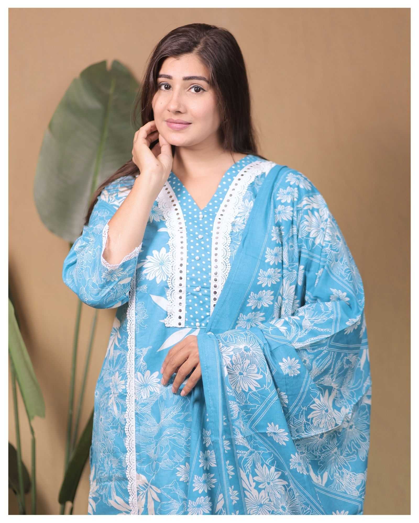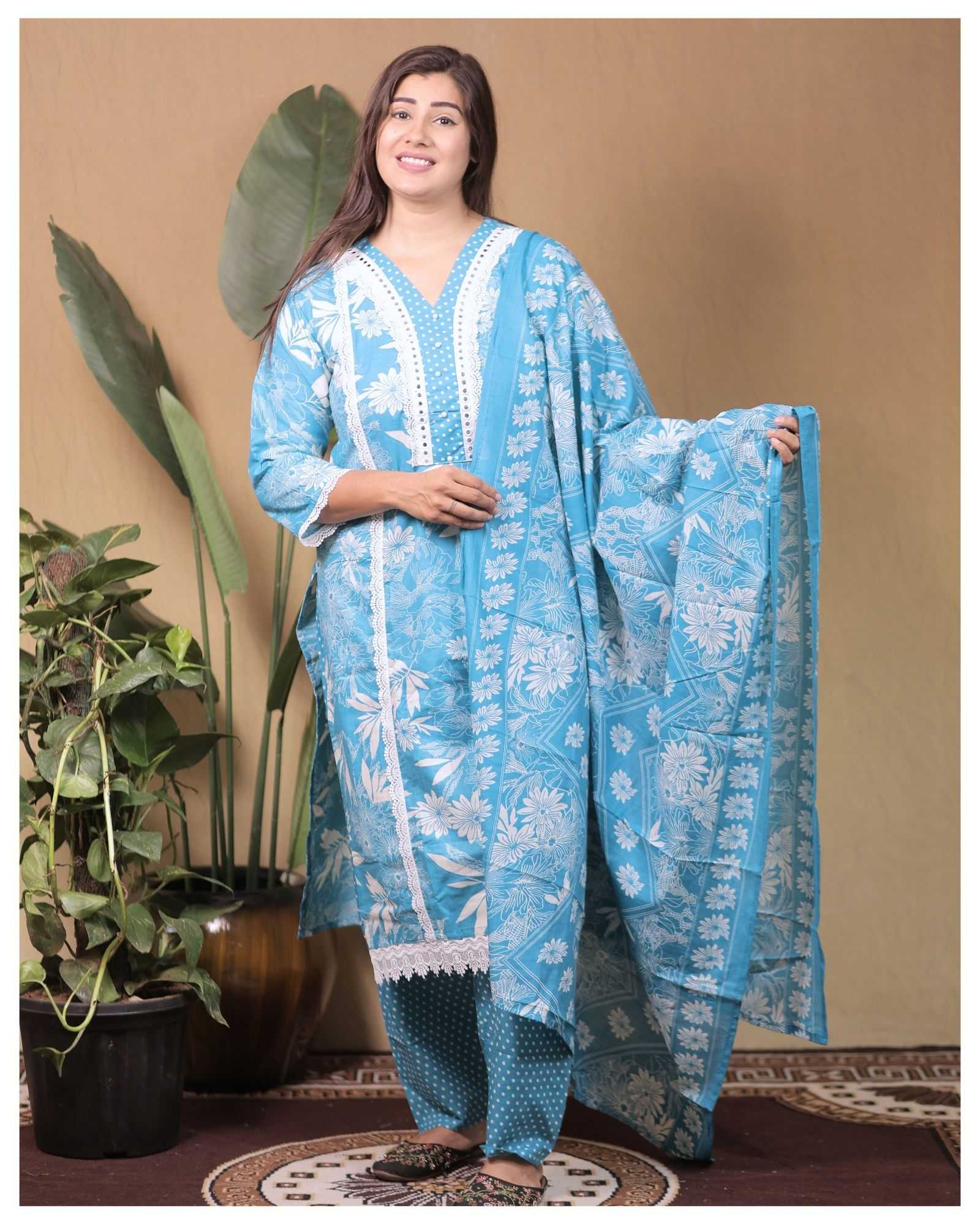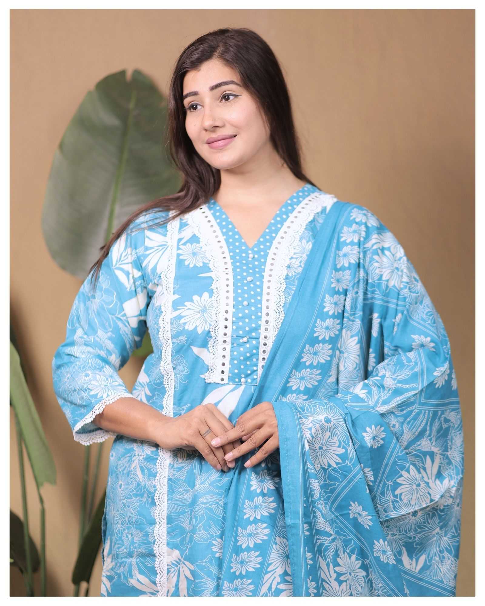 SKY BLUE PURE COTTON WITH HEAVY EMBROIDERY WORK TO FESTIVE WEAR STRAIGHT CUT KURTI WITH PAINT STYLE DESIGNER 3 PIECE COMBO SUITS IN WHOLESALE RATE IN SURAT