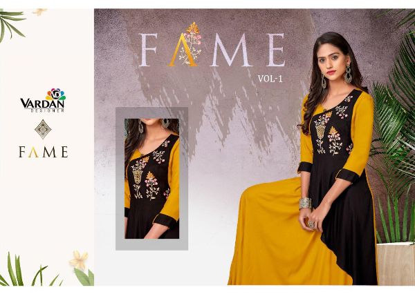 Vardan Designer Presents Fame Vol-1 Heavy Rayon Long Style Fancy Designer Kurtis Wholesale Rate In Surat
